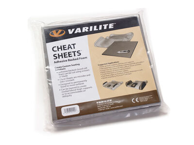 VARILITE Cheat Sheets are adhesive-backed sheets of closed-cell foam. Each package contains four pieces of foam measuring 10 x 10 inches (25 x 25 cm). Cheat Sheets can be cut with a blade or scissors and applied to a variety of surfaces.